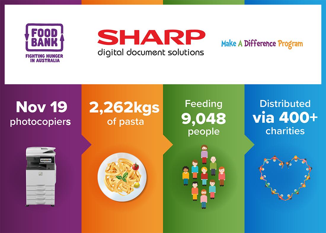 We've stepped up our initiative with our Make a Difference Program. We've now incorporated donations into every Sharp Photocopier deal, allowing us to generate some huge monthly donation figures. Leading up to Christmas every bit helps - thank you very much to our clients and staff for being part of the MADP.