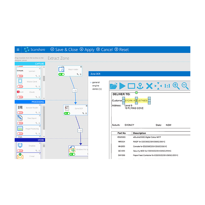 By prompting the operator to enter key information (meta data) at the time of scanning, Scanshare Essentials can make intelligent decisions as to how to distribute and deliver the digital documents. Users can initiate one-touch scanning directly from the panel of their multifunctional device, to capture and convert paper documents into the most appropriate format. These electronic documents can then be delivered via a connection to your company file server, document system or ERP solution.